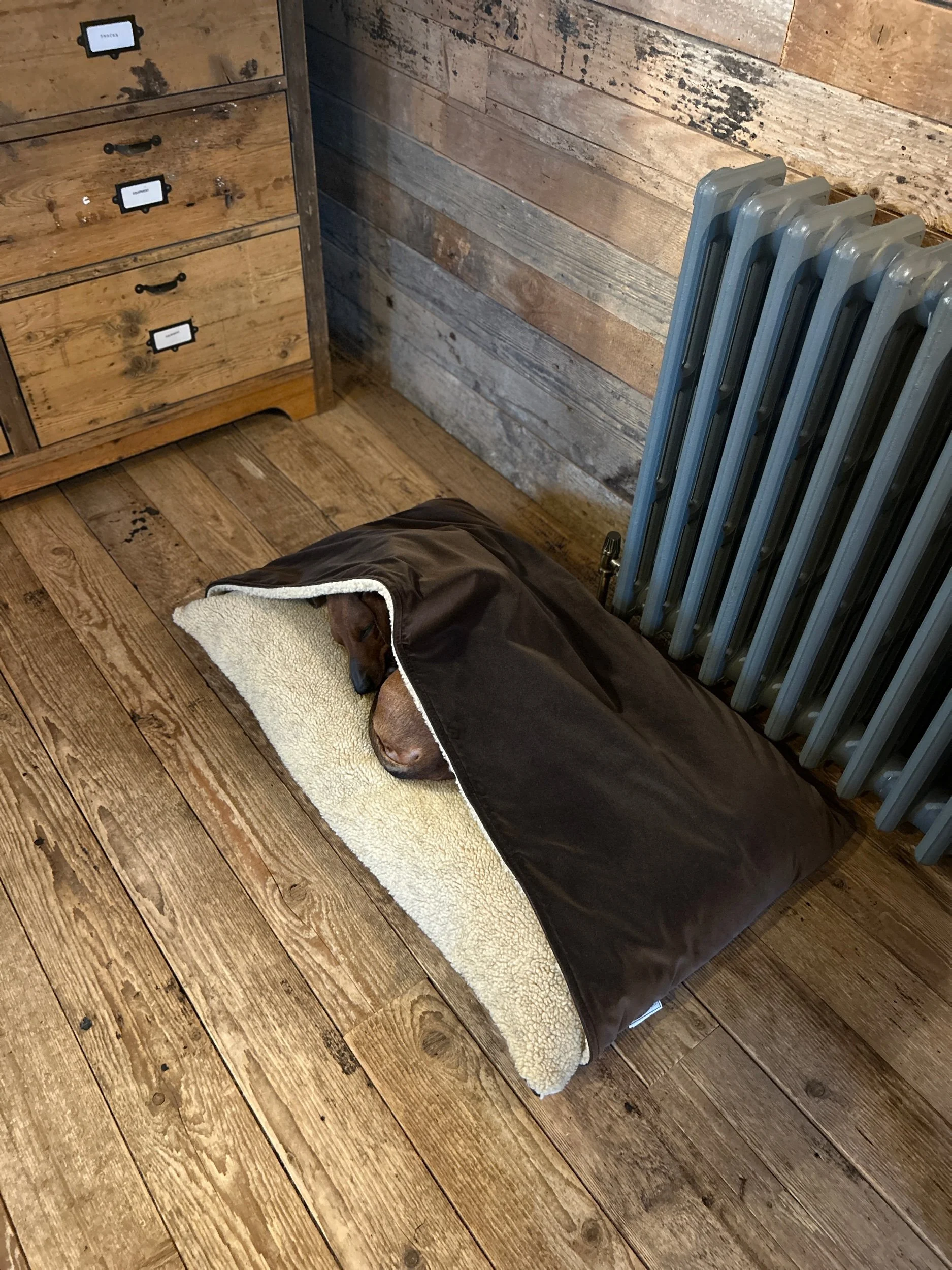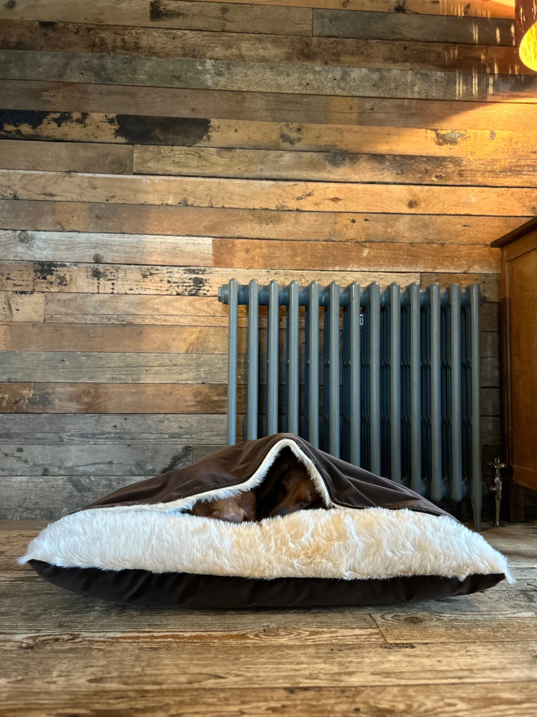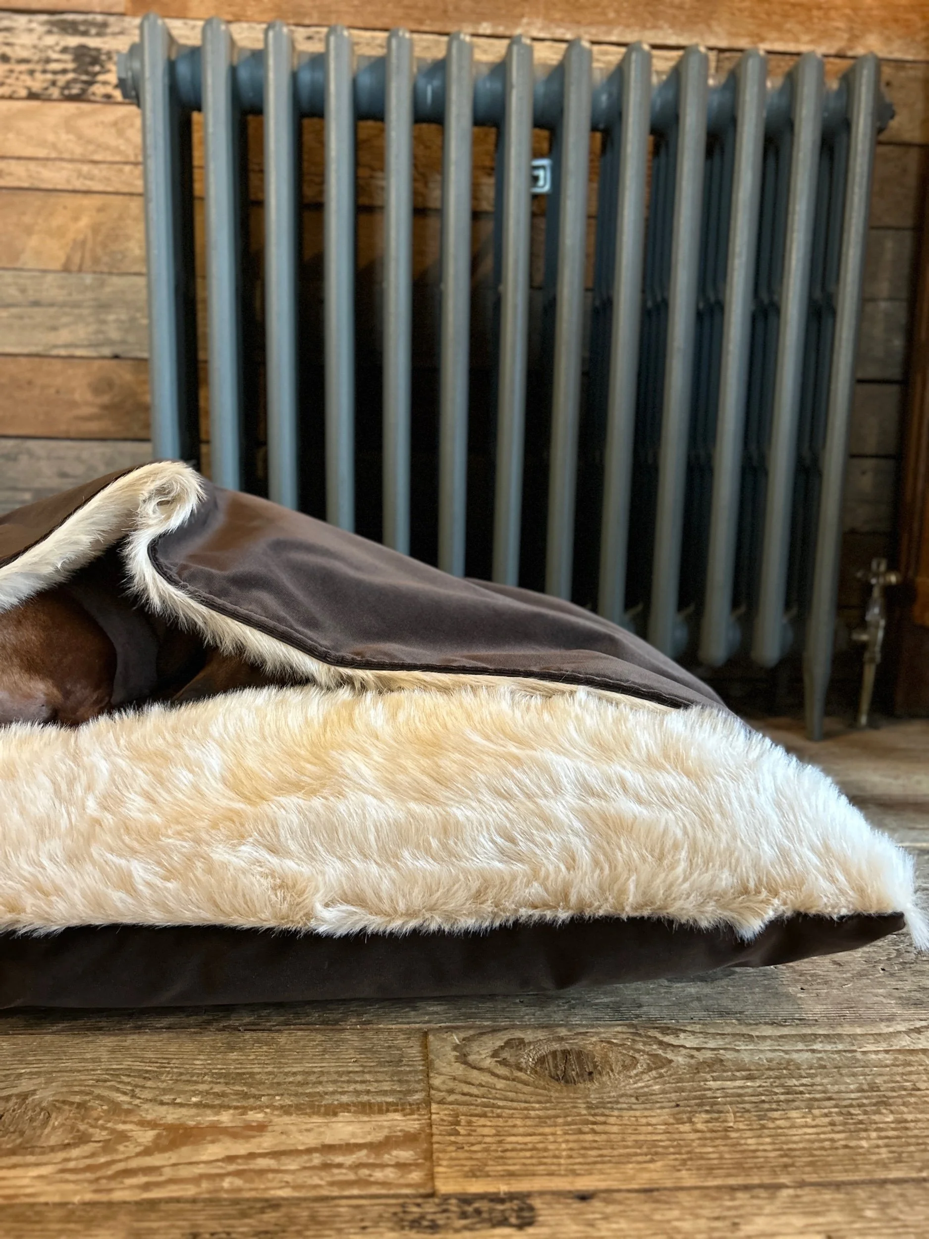With our Snuggle beds its really Important to not apply any heat to the fur to ensure your beds keep n new condition for as long as possible. When the time comes for washing machine wash on a low 30 Degs on a gentle cycle. Never use fabric softener as this changes the chemical composition of the faux fur and sherpa fleece. Once washed, do not twist to get any excess water out, simply leave to dry naturally away from any heat source. Never Iron or Tumble dry! During and after drying you will find that the hairs give the impression of being stuck together, however when its dry simply give the fur a gentle brush to make it nice and fluffy again!